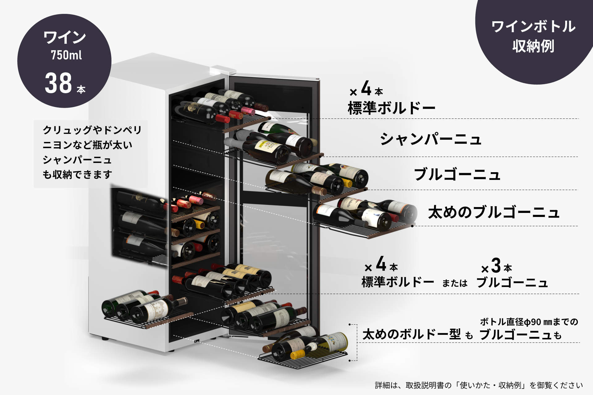 直径90mm程度まで、高さは330mm程度までのボトルが収納できます。収納本数については、ボルドーボトル(高さ300mm×直径75mm)とブルゴーニュボトル(高さ300mm×直径82mm)を半分ずつ収納した場合を基準としています。ただし、ボトルの直径や形状によっては、収納本数が減ることもあります。