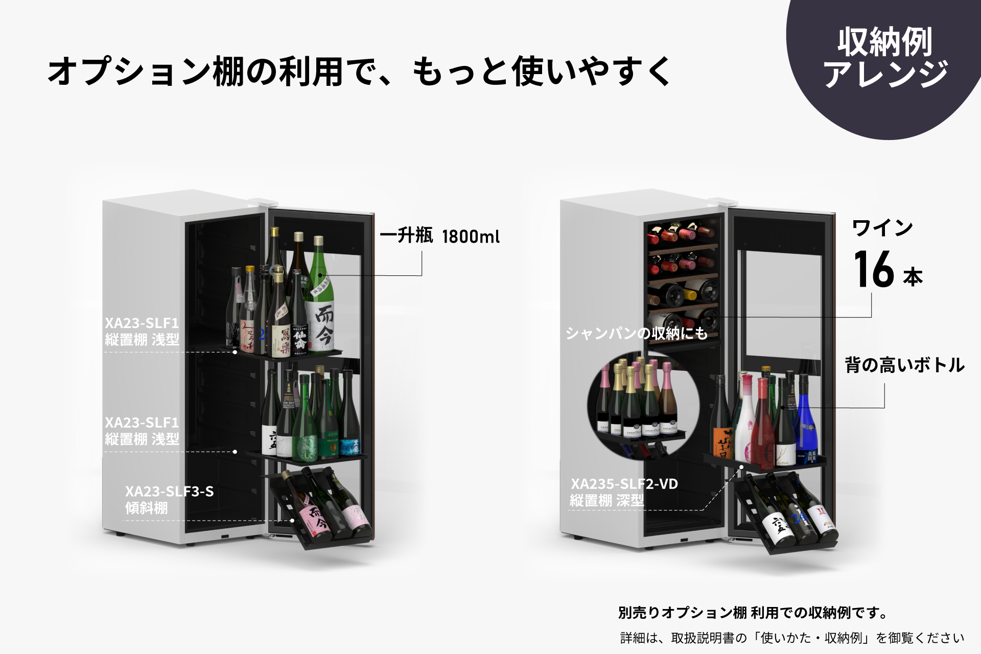 オプション棚を使えば、日本酒を大切に保管する SAKE CELLAR® としても活躍します。720mlの4合瓶を23本から最大35本まで収納可能。日本酒のボトルは蔵ごとに形や大きさが異なりますが、標準的なボトルに適した縦置き棚に加え、純米大吟醸で採用されやすい背の高いボトルにも対応する縦置棚もご用意。用途にあったオプション棚の選択が可能です。