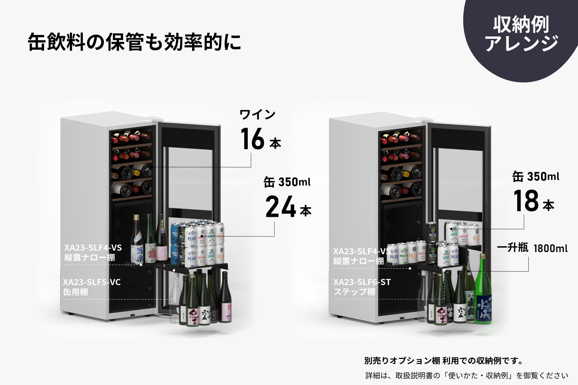缶飲料をすっきり整理できるオプション棚もご用意。冷蔵庫では難しい、缶ビールの“キンとした冷え”と日本酒の氷温保管を同時に叶えられる便利な棚です。温度帯を分けるのではなく、同じ温度でお酒の種類を整理して楽しみたい方に最適。 さらに、庫内のデッドスペースを有効活用するナロー棚、一升瓶や4合瓶、缶ビールを美しく収められるステップ棚など、多彩な棚をラインナップ。シーンやスタイルに合わせて、より自由な保管が可能です。