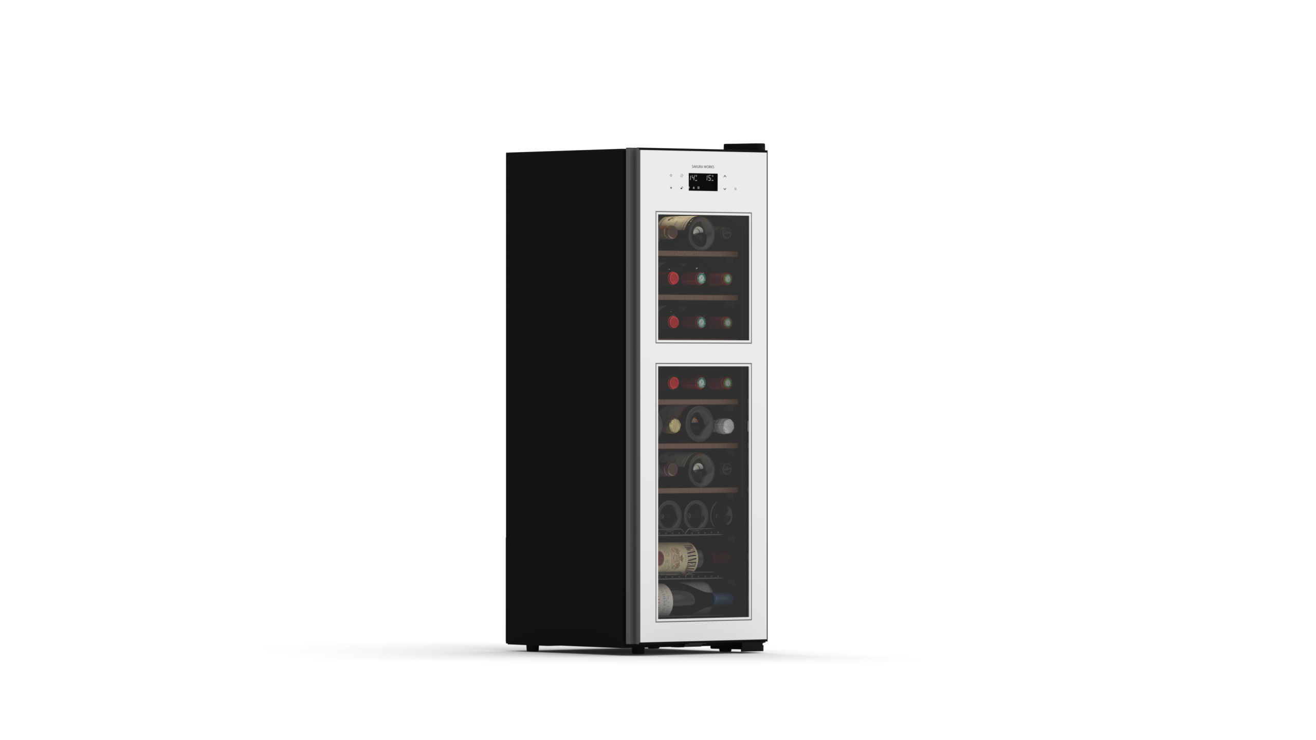 ガラスドアは、ワインや日本酒の保管に欠かせないアイテムです。3枚ガラス構成(T4 + A8 + T4L + A10 + T4L)を採用し、Ug値約1.35W/(m²·K)というワインセラーとしては高い断熱性能を実現しました。2面のLow-Eコーティングガラスが、外気温の影響を抑え、庫内温度の安定性を高め、繊細な熟成や保冷環境を保ち続けます。冷却負荷を軽減することで省エネ効果も期待できます
