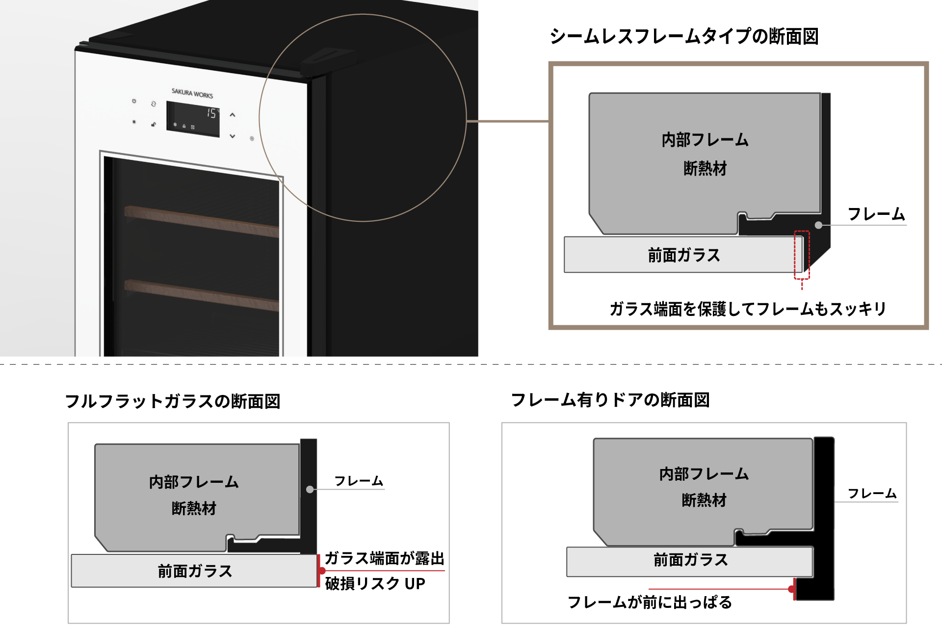一方、従来型フレームは端面保護に優れるものの、前面の出っぱりでドアが分厚く見え、フレーム部のカビも懸念点に。 当社はこのトレードオフをシームレスフレームで解消。デザイン性と耐久性の両立を実現しました。通常使用でガラスが割れることはほとんどありませんが、ワインセラーとしては唯一のガラス保証(6か月)(※2)も付帯しています。
