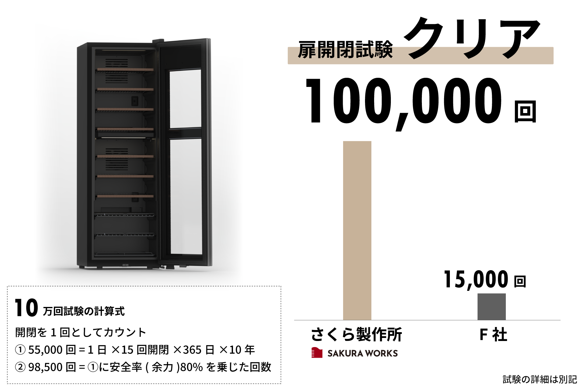メカニカルアームによる10万回のドア開閉試験に合格。特に日本酒を提供するレストランではワイン以上に開閉頻度が高いため、ヒンジやキャビネット剛性、パッキンには高い強度と耐摩耗性を備えた部材を採用しています。その結果、数年使用してもドアの下がりや摩耗が起きにくい耐久性を確保しました。 さらに、外観部品には長期間の使用でも自然劣化が起きにくい素材を、内部部品には錆や腐食に強い素材を採用。細部に至るまで耐久性を追求し、プロの現場にふさわしい堅牢な品質を実現しています。
