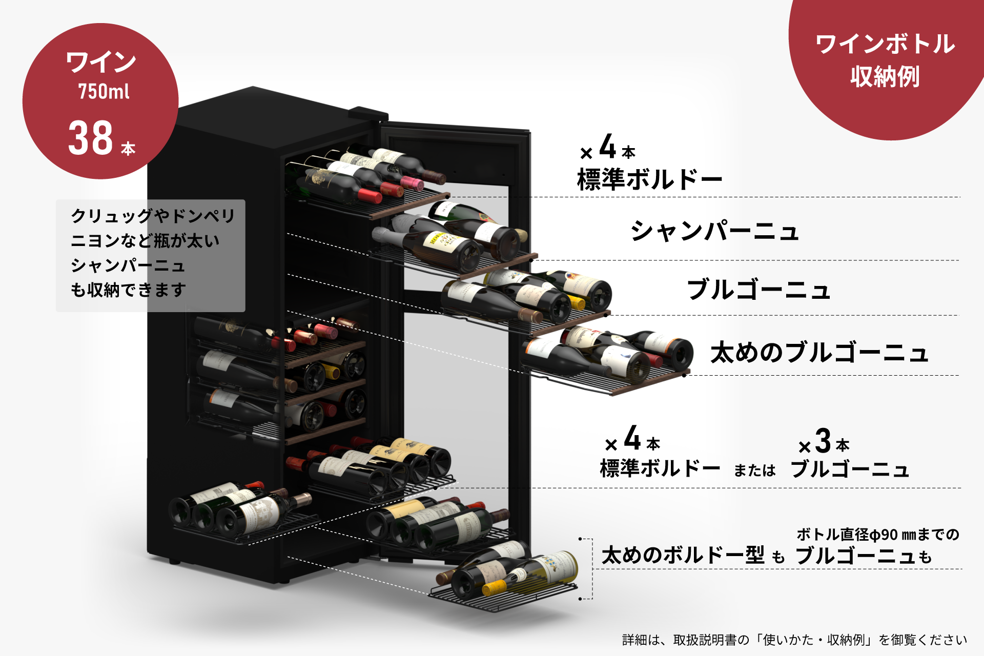 ボトル直径90㎜程度のボトルは収納できます。ボトルの高さは330㎜程度までが収納できます。収納本数換算は、ボルドーボトル(H300㎜×φ75㎜)とブルゴーニュボトル(H300mm×φ82㎜)を半々くらいに収納したもので、ボトル直径や形状によって減ることがあります。