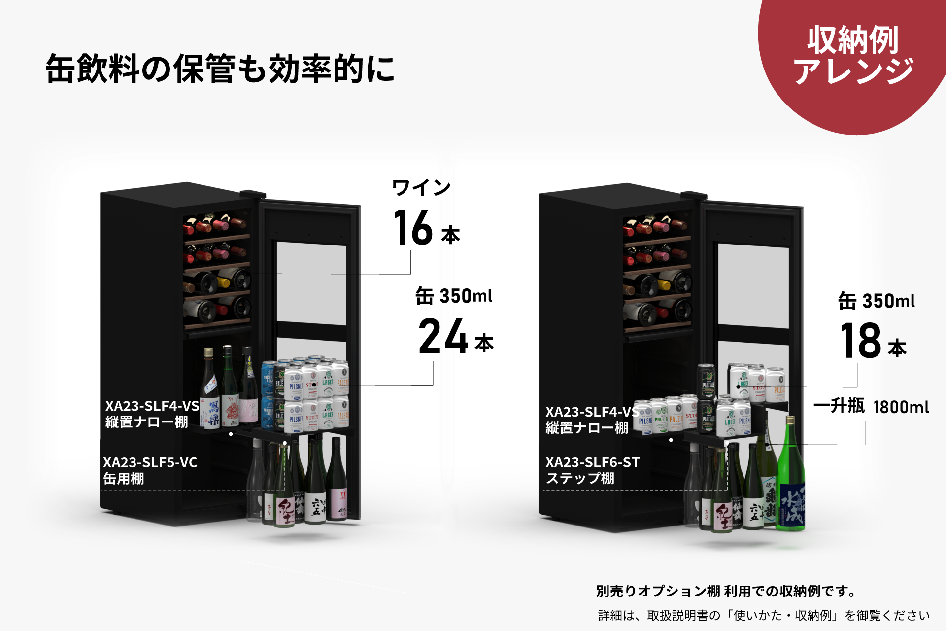 オプション棚による柔軟なカスタマイズをすれば、ワインや日本酒だけなく、ビール、一升瓶まで美しく収まる収納設計です。冷蔵庫では実現が難しい低温ビールの保管も可能に。嗜好に寄り添う、洗練された一台です。