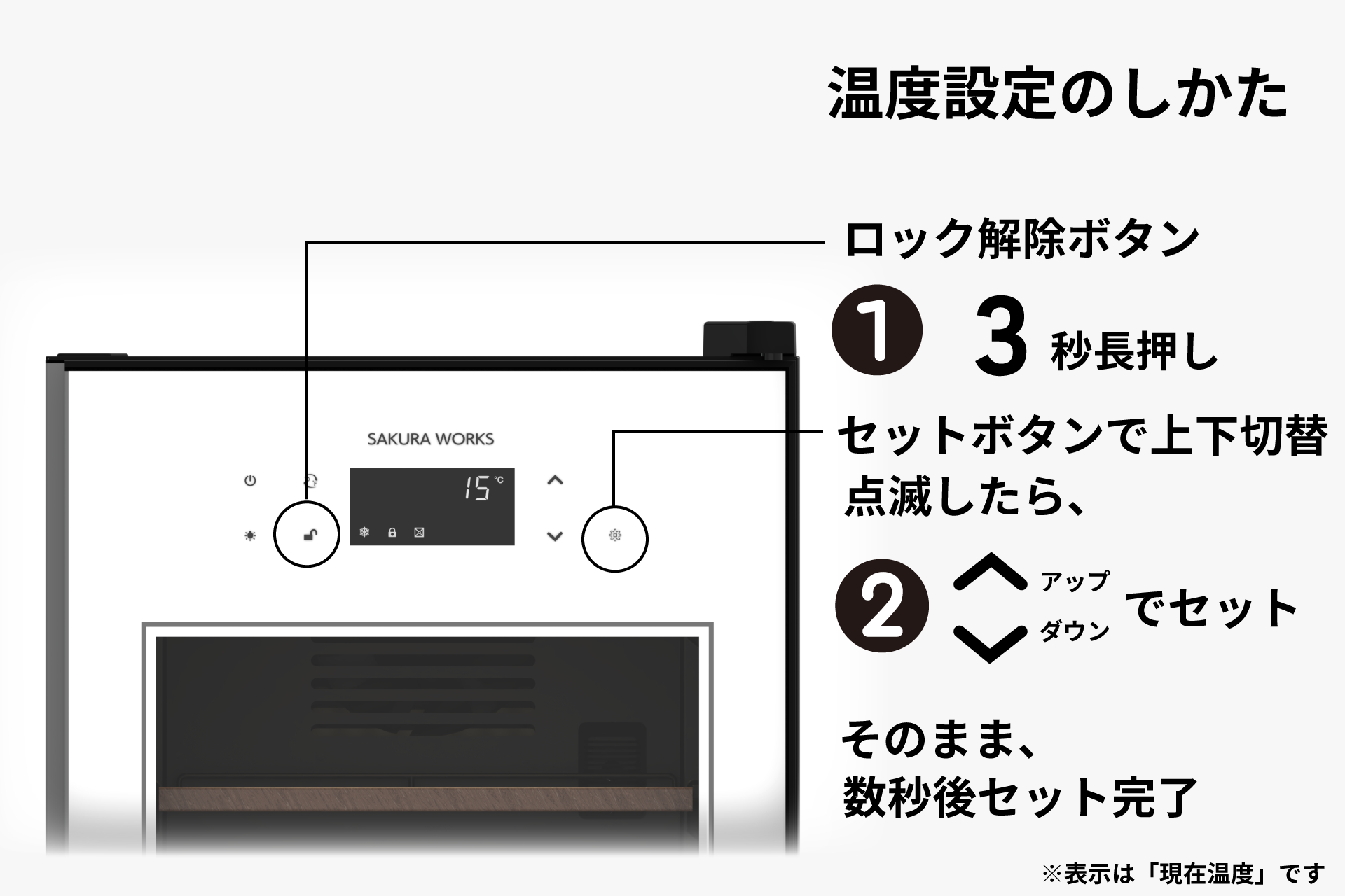 使い方はとても簡単です。ロック解除ボタンを長押しし、上下キーで温度を選ぶと自動で設定(※1)されます。1℃単位で調整でき、操作部は本体前面にあるため、ドアを開けずに温度やライトのON/OFF操作が可能です。冷気を逃さないので省エネ(※2)や静音運転にも効果的。さらに、誤操作による温度変更を防ぐ安心仕様となっています。