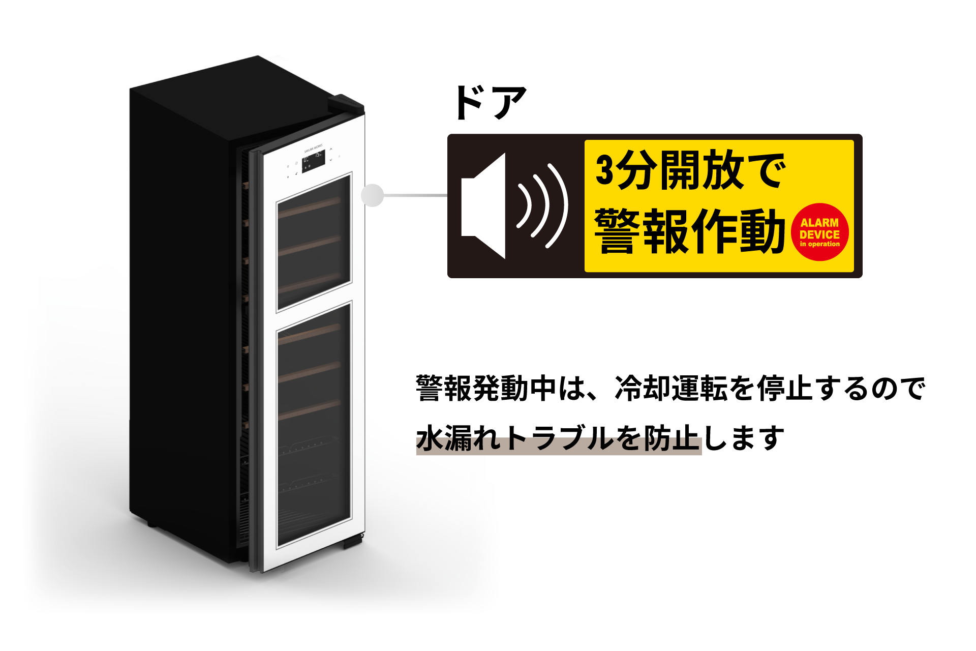 これは隠れた重要機能。理由は、コンプレッサー式ワインセラーも含めた冷蔵機器はドアがわずかに開いたまま気づずに稼働すると、たった1日で300ml以上の水分を吸い込み(※3)ます。その結果、水漏れや床の汚れといったトラブルにつながる恐れがあるからです。 家庭用冷蔵庫では一般的な「ドア開放アラーム」ですが、ワインセラーで搭載されているのは極めて稀。 ご家庭での安心と快適さを守るために、その機能をしっかり備えています。