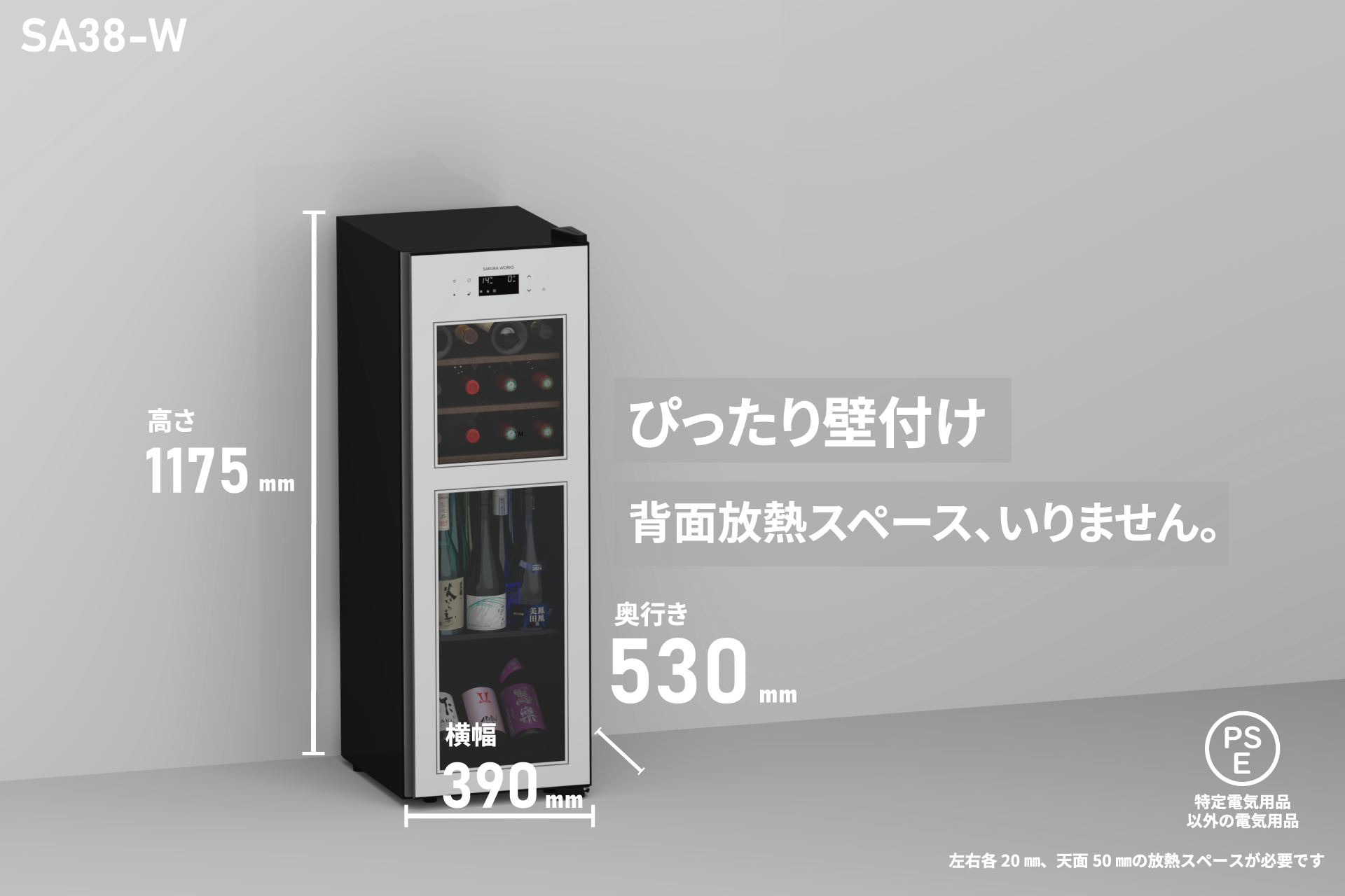 スリムなタワー型で設置面積を最小化。38本の収納力を備えつつ、上下二室の縦型2温度で省スペースのまま高精度な温度管理が可能です。奥行きは530mm、背面は壁にぴったり付けて設置でき、独自の放熱設計でクリアランスを確保。背面に配置した制御基板をコンプレッサー熱から守る安心構造です。丸型PSE対応機種です。