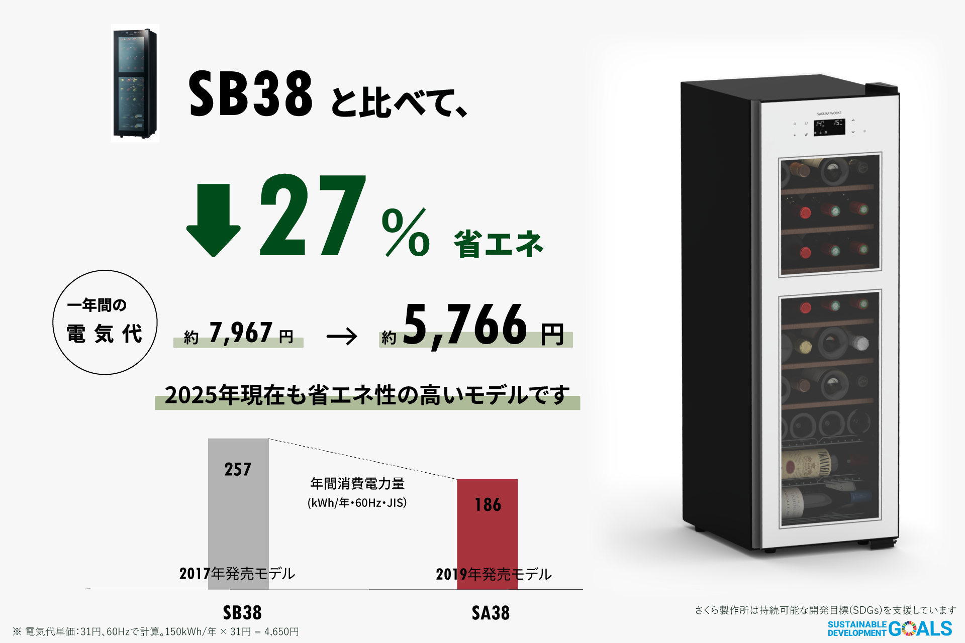 冷却時間も短縮や断熱性の向上によって、前回モデルのZERO classシリーズ SB38と比較して、最大約27%の省エネ化を実現しています。年間の電気代も約5,670円ほどと、同等サイズのワインセラーと比較すれば、高い省エネ性を搭載しているモデルです。
