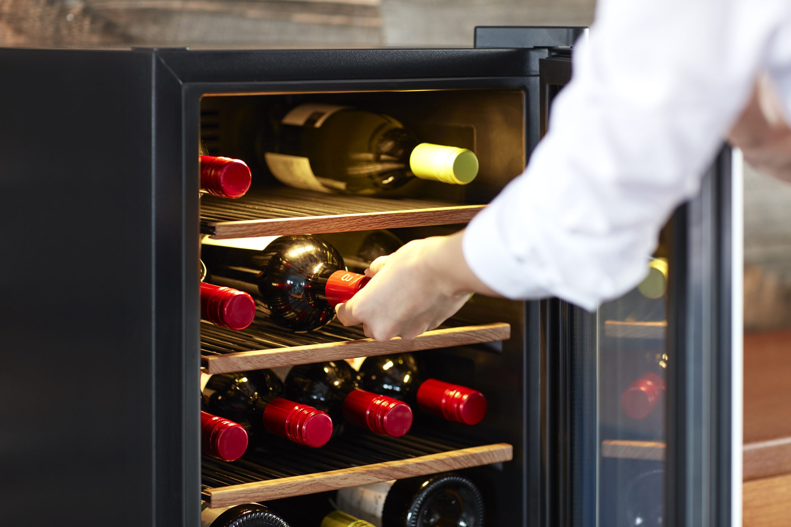 シャンパーニュやブルゴーニュなど、一般的なセラーでは出し入れしにくい太めのボトルもストレスなく収まります。ボルドー、ブルゴーニュ、シャンパーニュなど形状の異なるボトルでも1列に収納できるため、レイアウトの美しさはもちろん、従来よりも効率的にお酒を収納することが可能です。見た目の整然さと使いやすさを両立した、ワイン愛好家やプロのソムリエにもご満足いただけるセラーです。