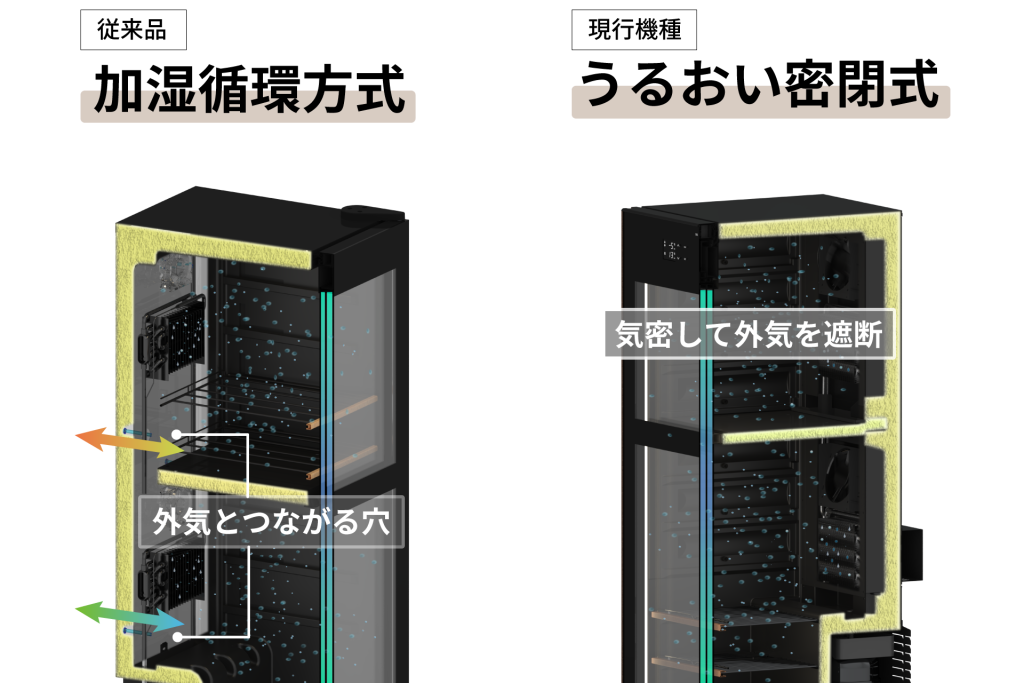 多くのセラーは外気を取り込んで加湿しますが、日本の冬の乾燥した空気を取り込むのは逆効果です。さくら製作所の「うるおい密閉方式」は、外気を遮断し、庫内で発生した結露水を湿度として還流させます。これにより、面倒な水足しやフィルター交換なしで、年間を通じてコルクに最適な湿度を維持します。