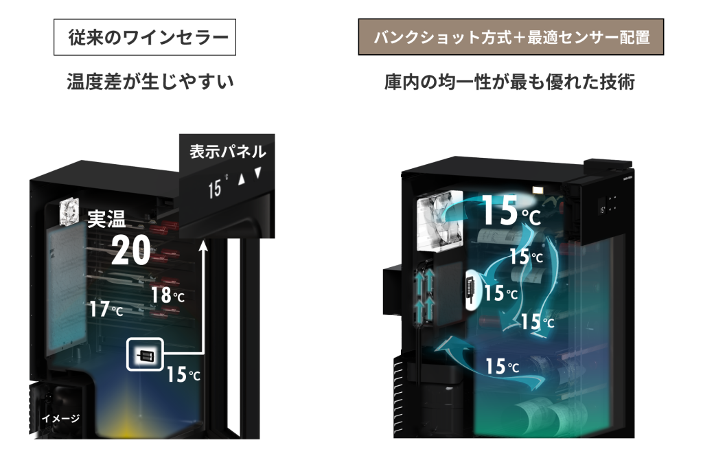 これは、冷気を直接ボトルに当てず、セラーの天板に一度衝突させてから、計算された角度で庫内全体に優しく拡散させる技術です。