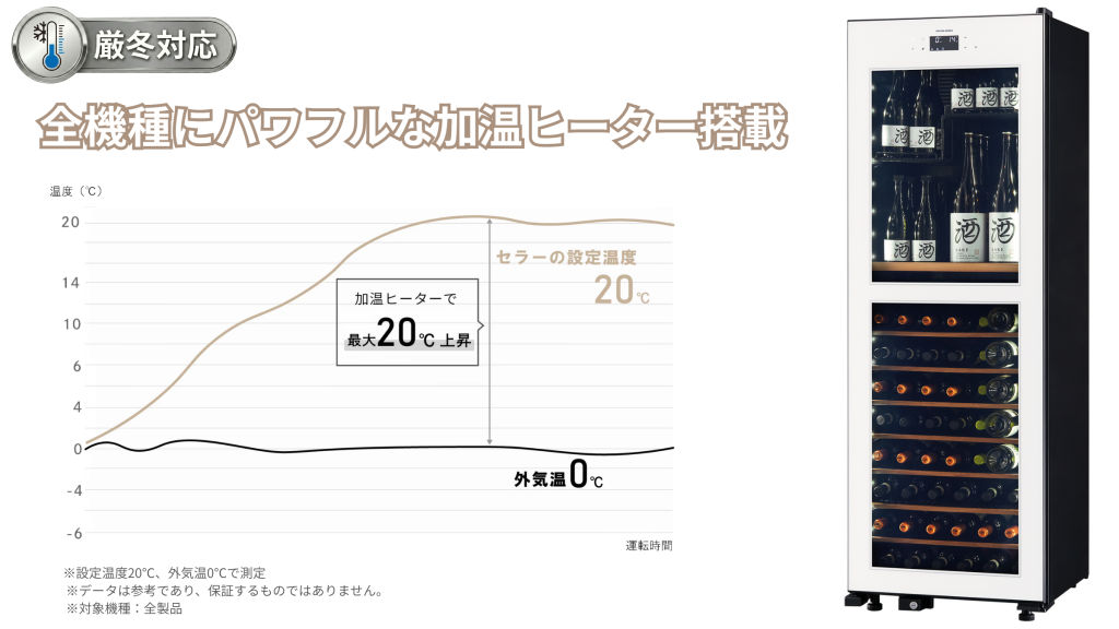 寒冷地や冬期の室内は、逆に室温が0℃近くになり、ワインが凍結したり冷えすぎて熟成が止まるリスクがあります。そのため、さくら製作所では、全シリーズにパワフルな加温ヒーターを搭載。外気温が設定温度より下がった場合、自動的にヒーターが作動し、外気温より最大20℃以上温度を上昇させることが可能です。北海道の冬でも、沖縄の猛暑でも、庫内は常に一定の温度が守られます。