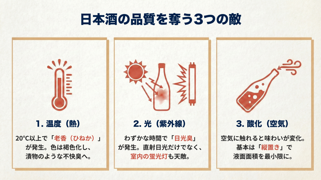 まずは、日本酒を劣化させる3大要因と基本的な対策について解説します。