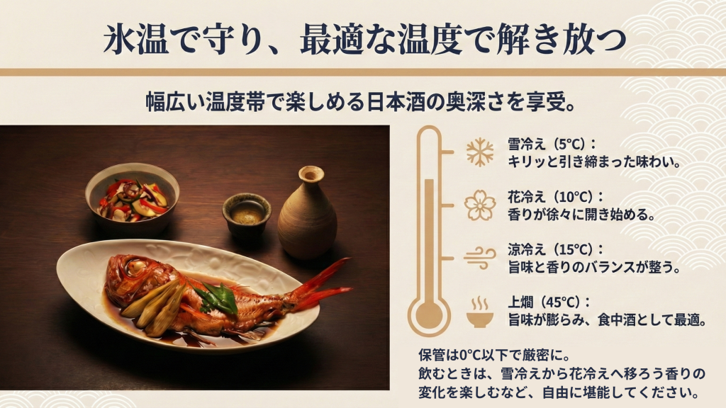 日本酒の最大の魅力は、5℃から55℃以上まで、幅広い温度帯で味わいが変化することにあります。氷温で最高の状態をキープしながら、飲む瞬間には好きな温度帯まで上げて、そのポテンシャルを最大限に楽しみましょう。