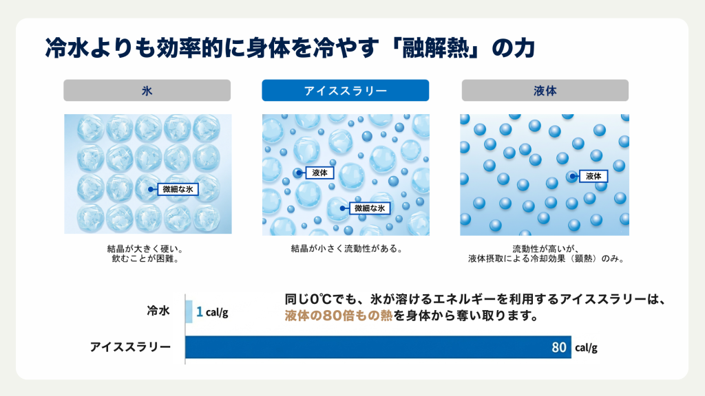 つまり、同じ0度の状態であっても、液体と氷が混ざり合った状態のアイススラリーは、冷水と比較して圧倒的に多くの熱を体内から奪い取ることが可能です 。