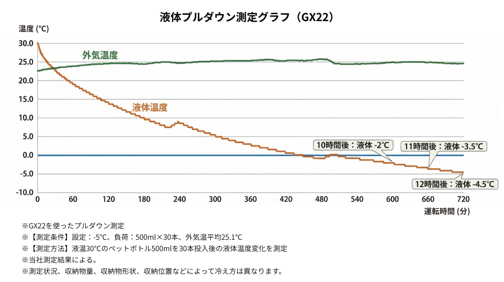 氷温M5はパワフルな冷却性能を持ち、小型モデル「GX22SM525」 を用いた検証データでは、その驚異的なパフォーマンスが証明されています。